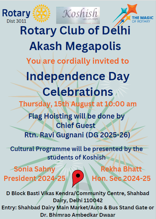 In August, the Rotary Club of Delhi Akash Megapolis celebrated India’s Independence Day with great enthusiasm and patriotism. The event brought together club members, families, and guests in a spirit of unity and service. The celebration featured a flag hoisting ceremony, cultural performances, and reflections on the values of freedom and democracy. The club also used this occasion to promote the importance of community service as a way to honor the sacrifices of the nation’s heroes.